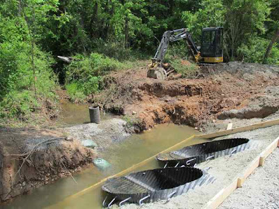 I guess VDOT got tired of pouring gravel in the hole and decided to fix it. Because our land is beside the bridge, we had to give them an easement so they could replace the bridge. Here's the old metal pipe the creek flowed through. (The land to the left is our property.)